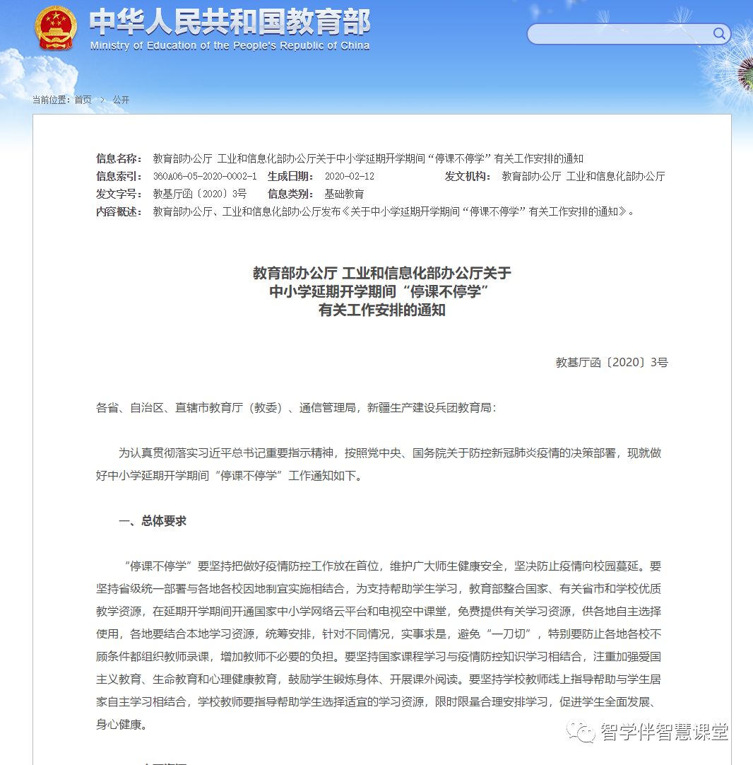 因防控新冠肺炎疫情需要,学校延期开学,学生不能在正常开学时间到校上课学习。2020年2月12日,教育部办公厅、工业和信息化部办公厅联合印发《关于中小学延期开学期间“停课不停学”有关工作安排的通知》(以下简称《通知》),对“停课不停学”工作提出明确意见。