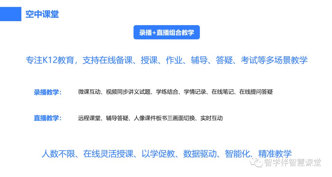 在此次疫情防控期间,为帮助区县教育局、学校解决因疫情停课问题,真正做到“停课不停学”,智学伴“云教室”空中课堂方案为教师提供集教研、备课、直播教学、录播教学、测评、微课录制、发布考试、交流为一体的一站式教学空间服务,为学生提供集学习、练习、答疑、在线考试、交流为一体的一站式学习空间服务。为家长提供全方位了解孩子成长的互动空间服务;为学校提供集学校信息发布、教学教务管理、资源管理为一体的综合化管理空间服务。
